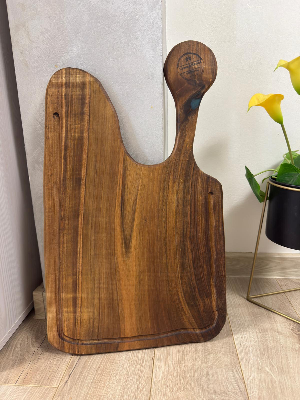 Acest tocător din lemn masiv de nuc, cu inserții din rășină epoxidică turcoaz, este o piesă artizanală unicat realizată manual, care îmbină frumusețea naturală a lemnului cu un accent modern și vibrant.