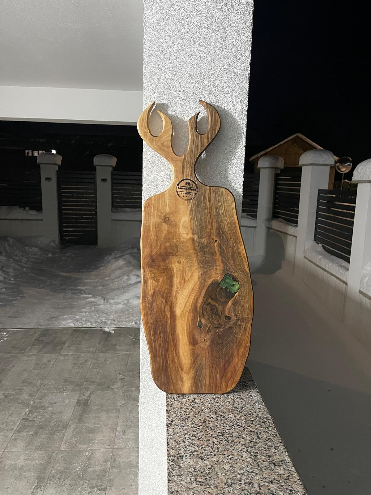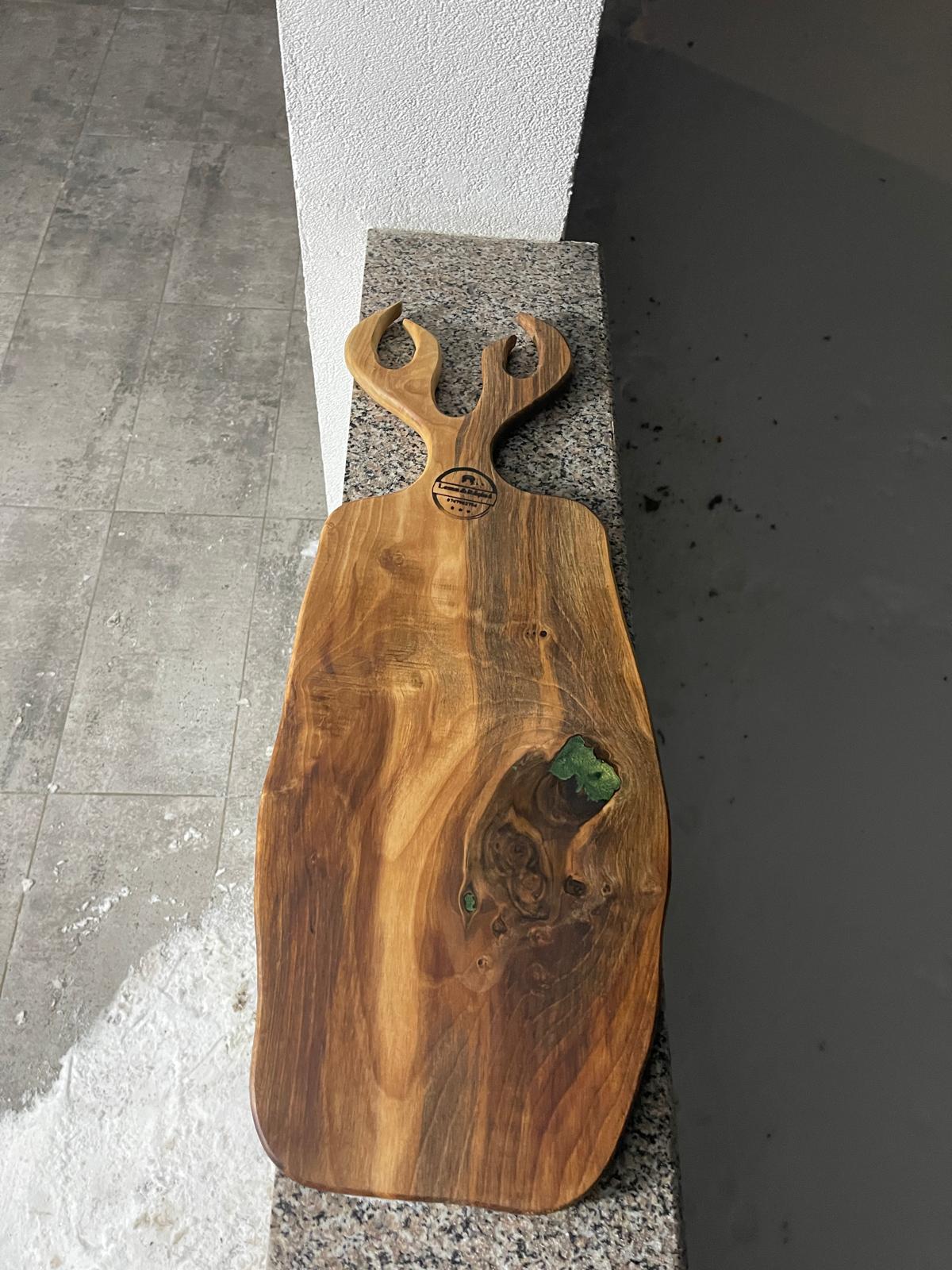 Tocător unicat realizat din lemn masiv de nuc, cu inserții din rășină epoxidică verde și mâner sculptat în formă de coarne de căprioară. Dimensiuni 70×28 cm, ideal pentru bucătărie sau servire elegantă. Tratată cu ulei special sigur pentru contact alimentar, iar rășina este certificată pentru contact cu alimentele.