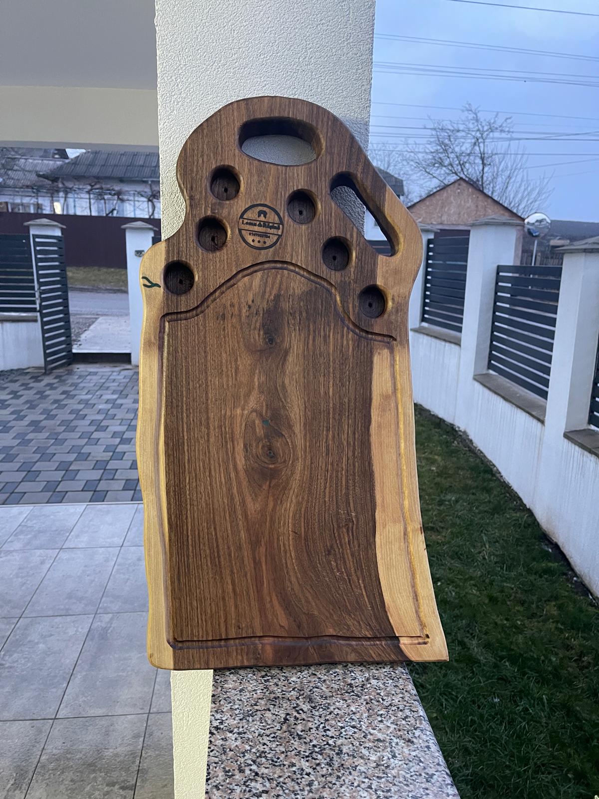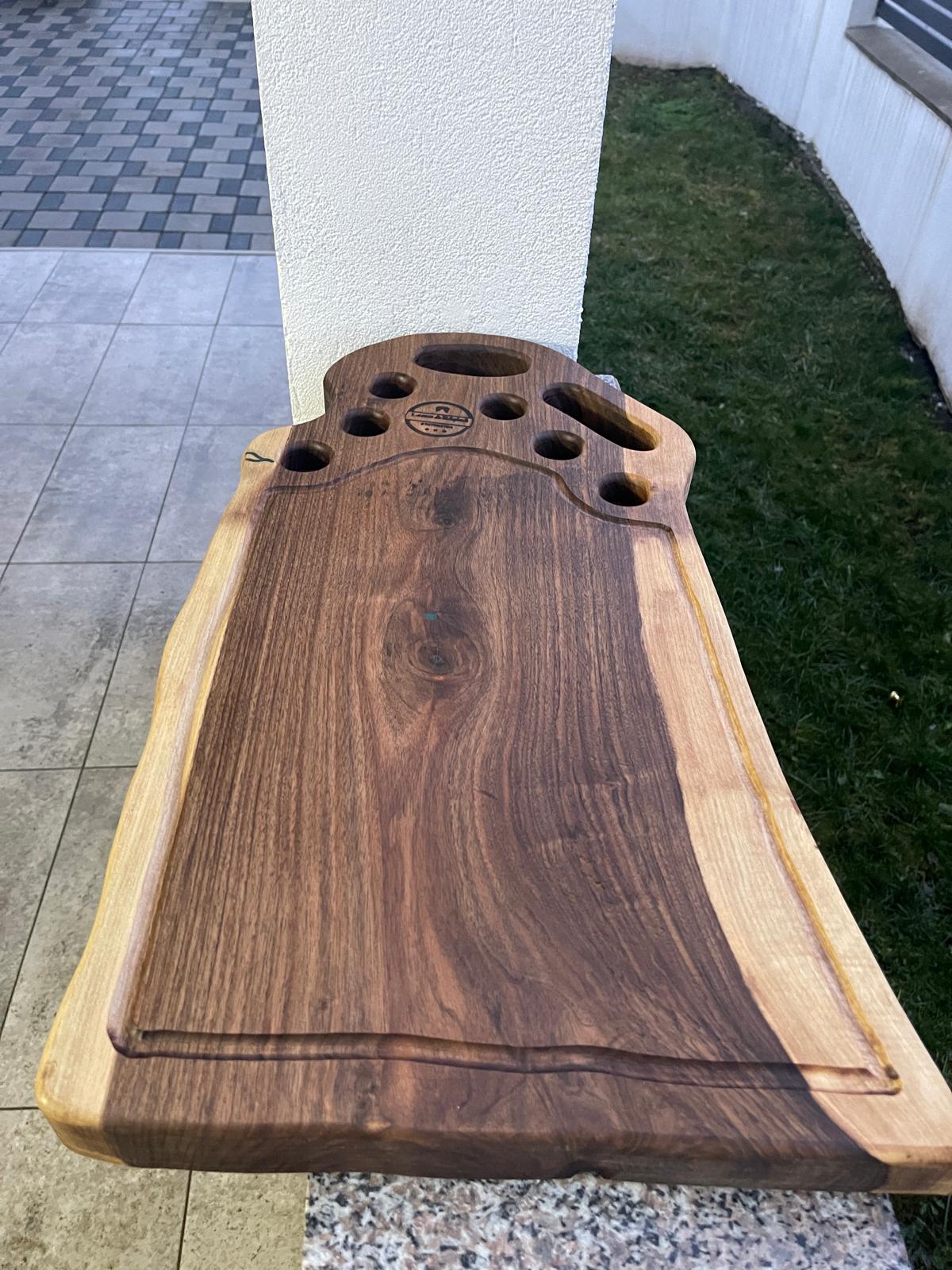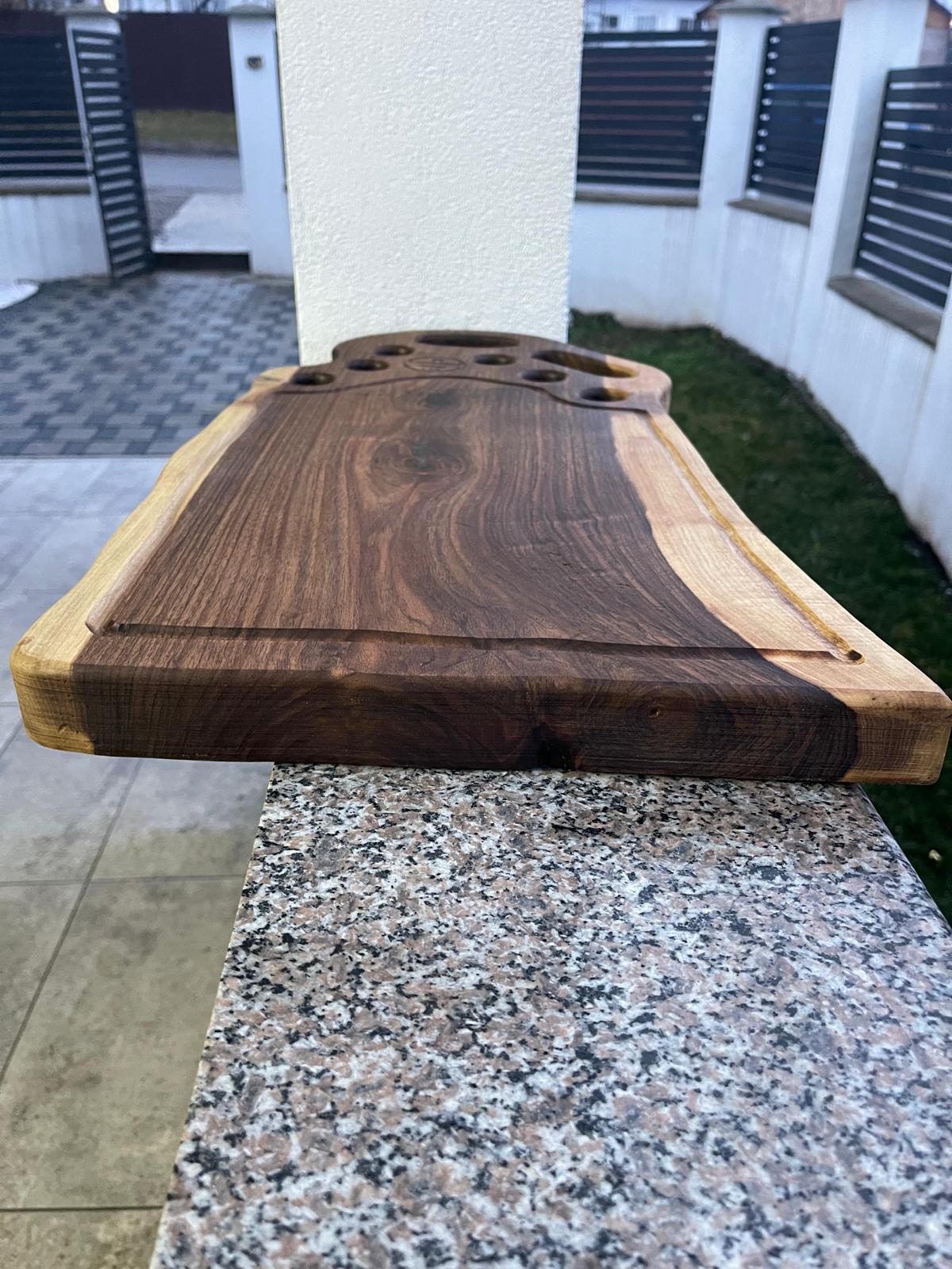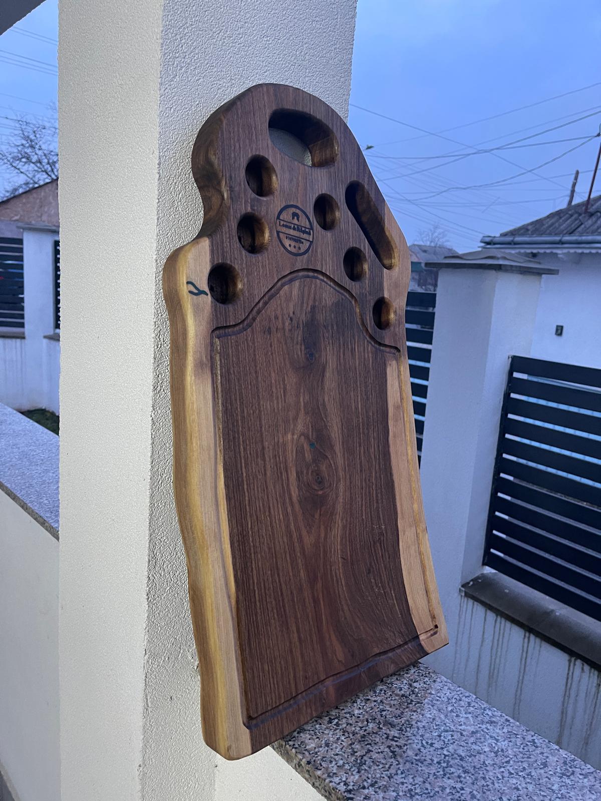 Acest tocător este realizat manual din lemn de nuc masiv, un lemn apreciat pentru durabilitate, textură unică și aspectul său elegant. Designul special include 6 găuri pentru pahare de shot, transformând tocătorul într-o piesă perfectă atât pentru servire, cât și pentru prezentare la mese festive, petreceri sau evenimente speciale.