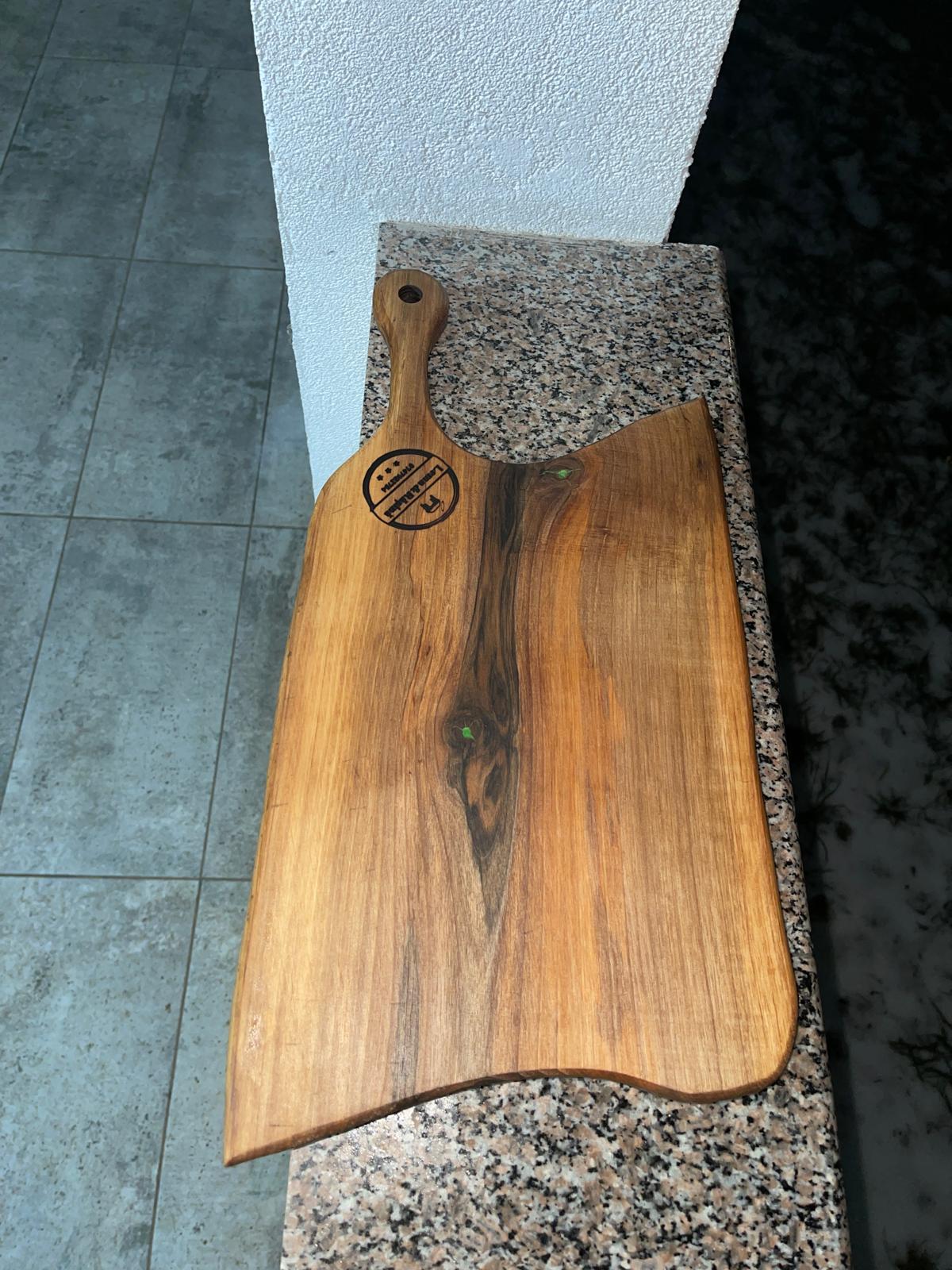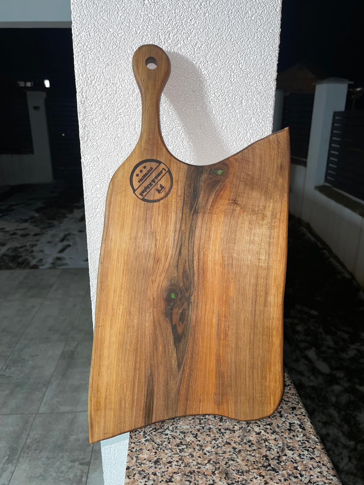Produsul este tratat cu ulei special sigur pentru contact alimentar, care protejează lemnul și îi evidențiază frumusețea naturală. Inserțiile din rășină folosesc rășină certificată pentru contact cu alimentele, garantând siguranța în utilizare.