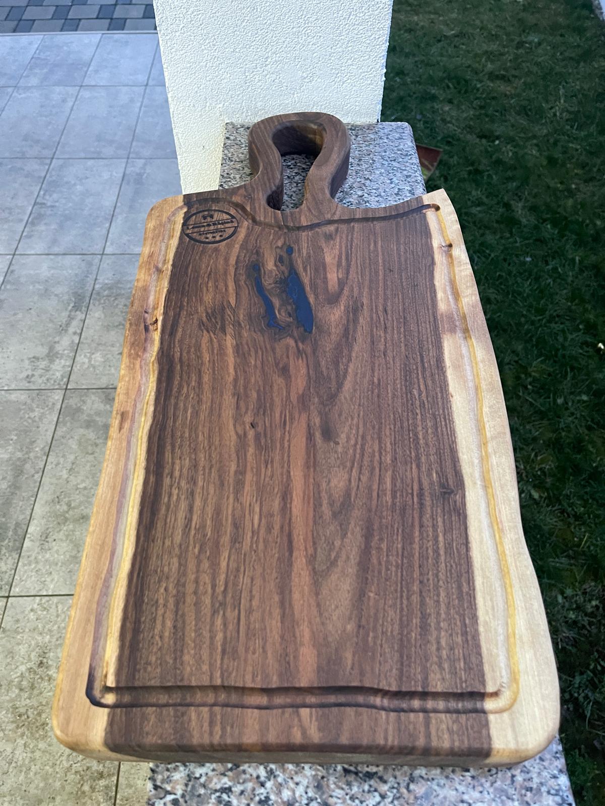 Tocător premium din lemn de nuc masiv, cu inserție de rășină epoxidică albastră și scurgător de grăsimi. Poate fi folosit pe ambele fețe, fiind ideal atât pentru gătit, cât și pentru servire. Tratat cu ulei sigur pentru contact alimentar și realizat cu rășină certificată pentru contact cu alimentele.