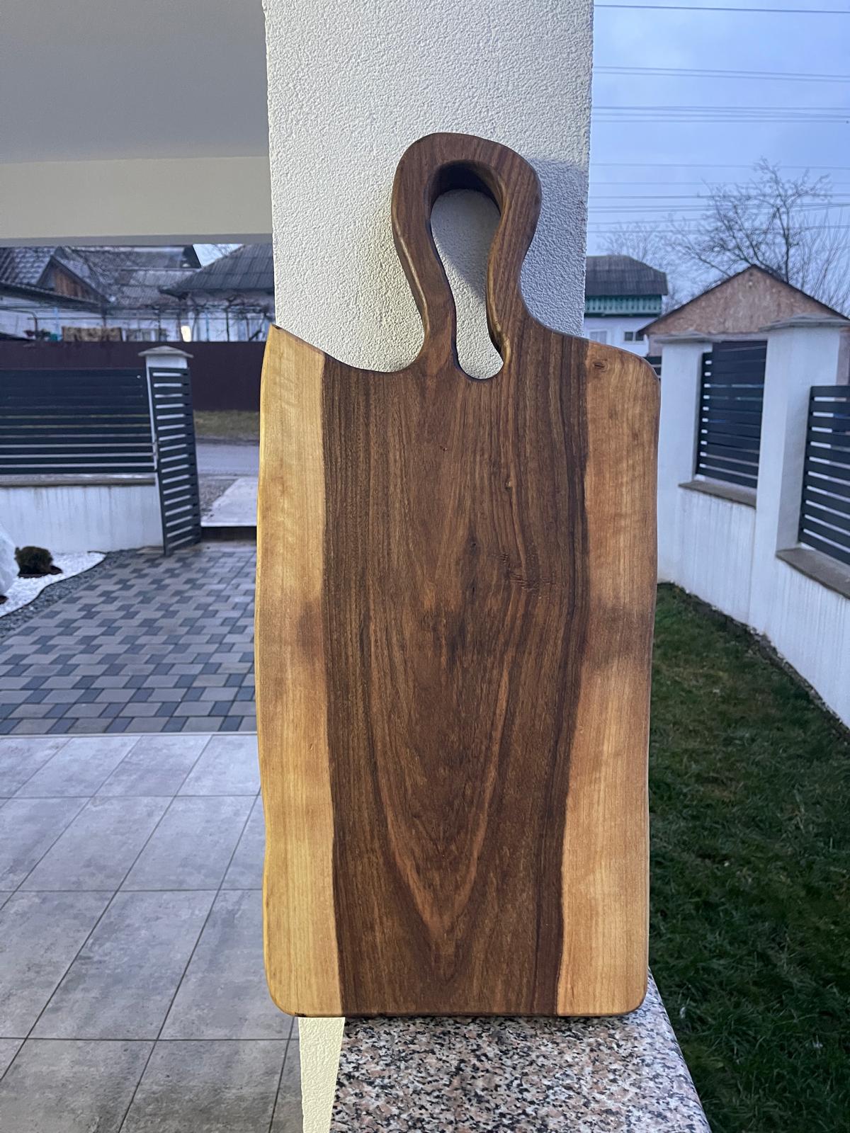 Produsul este tratat cu ulei special sigur pentru contact alimentar, care protejează lemnul și îi păstrează frumusețea naturală. Inserțiile din rășină folosesc rășină certificată pentru contact cu alimentele, garantând siguranța în utilizare.