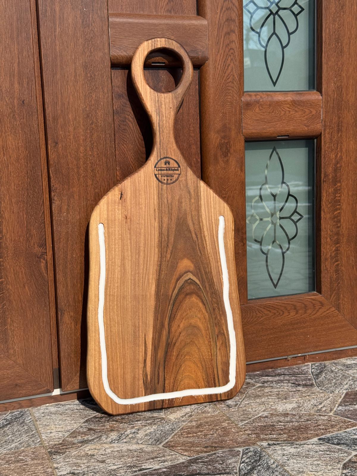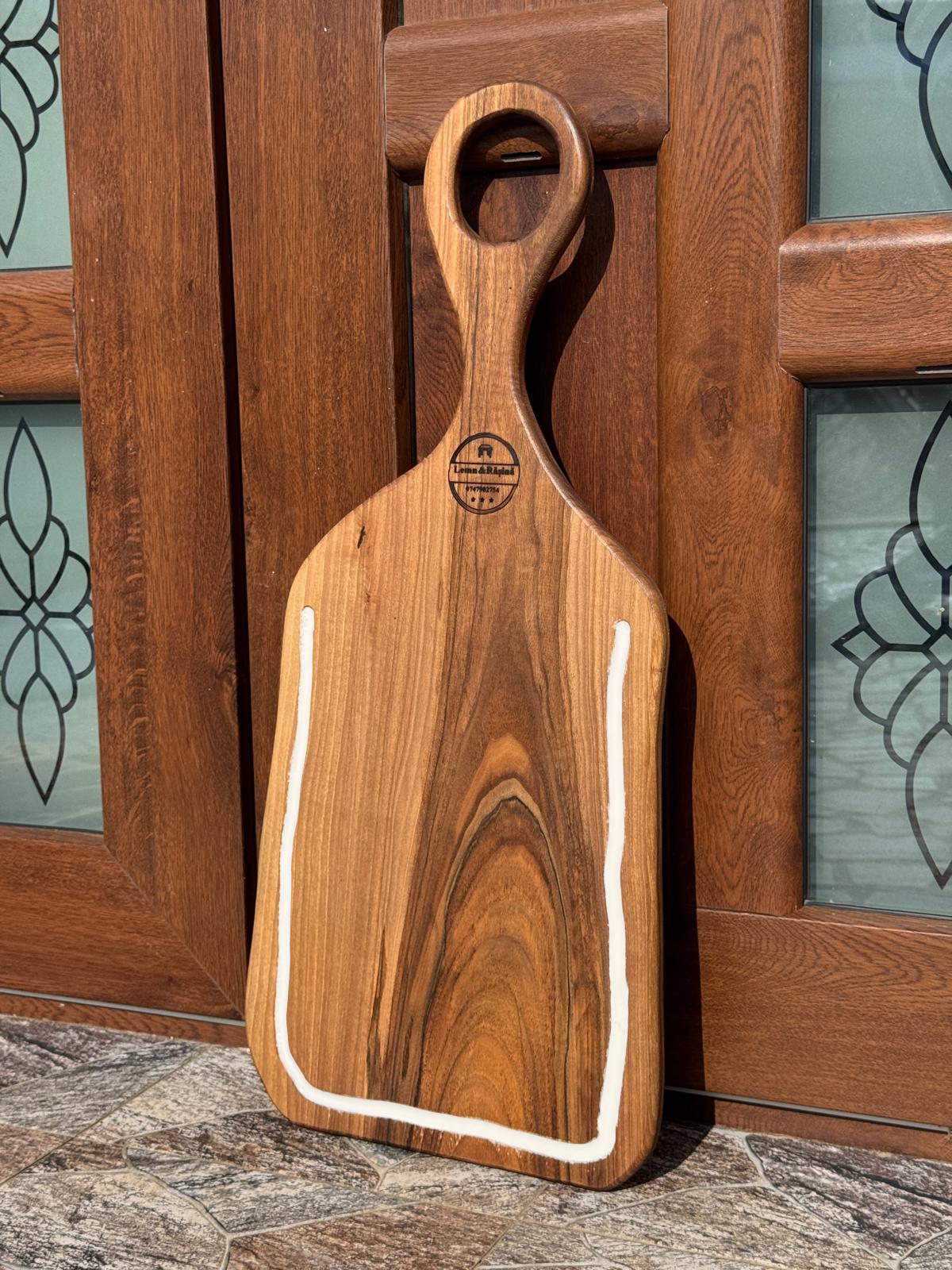 Lemnul de nuc este cunoscut pentru rezistență și textura sa elegantă, iar inserțiile de rășină epoxidică creează un contrast vizual spectaculos. Suprafața este finisată manual și tratată cu ulei alimentar, pentru protecție și siguranță în utilizare.
