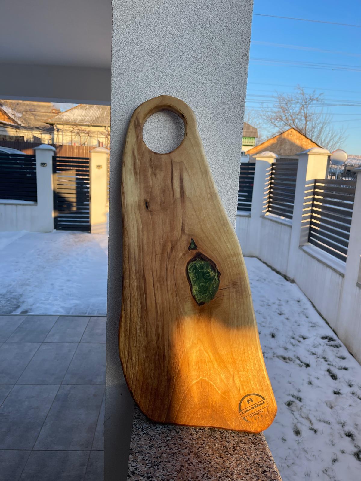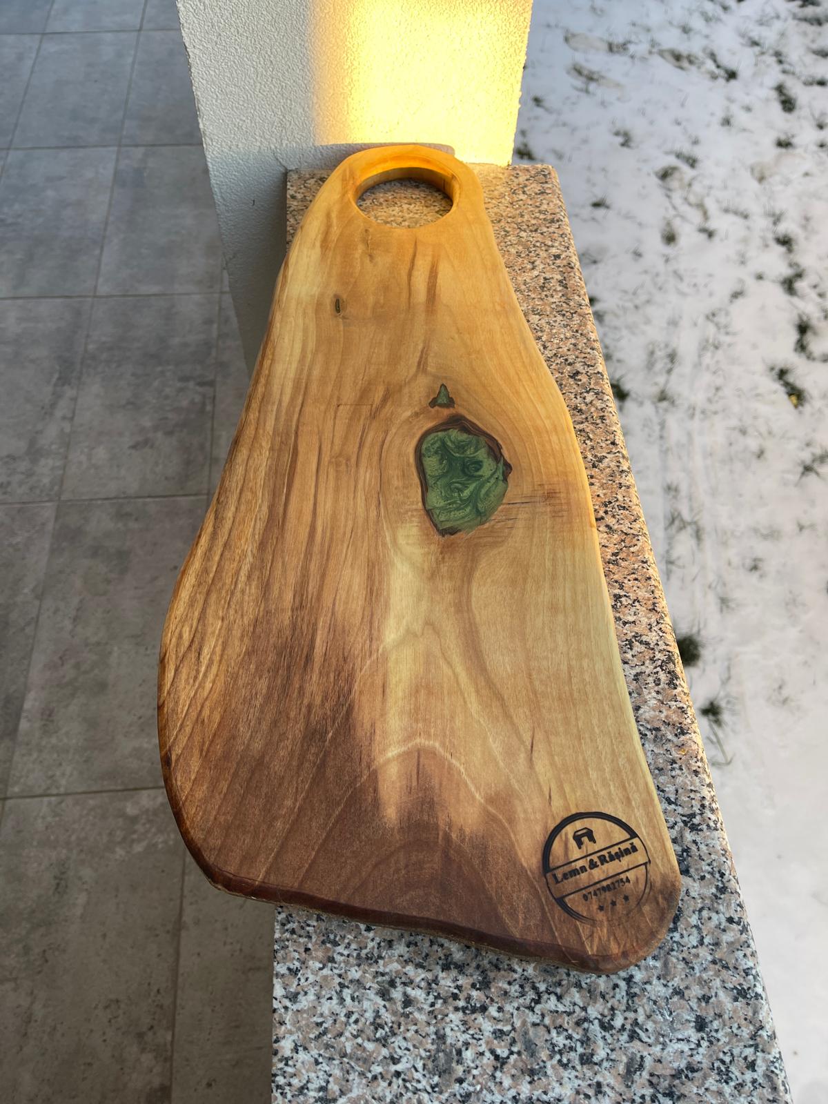 Rășina epoxidică verde este turnată în mod special în nodul lemnului, punând în valoare forma naturală și transformând imperfecțiunile în elemente de design. Rezultatul este un tocător cu un aspect modern, dar autentic, care îmbină frumusețea naturală a lemnului cu eleganța rășinii.