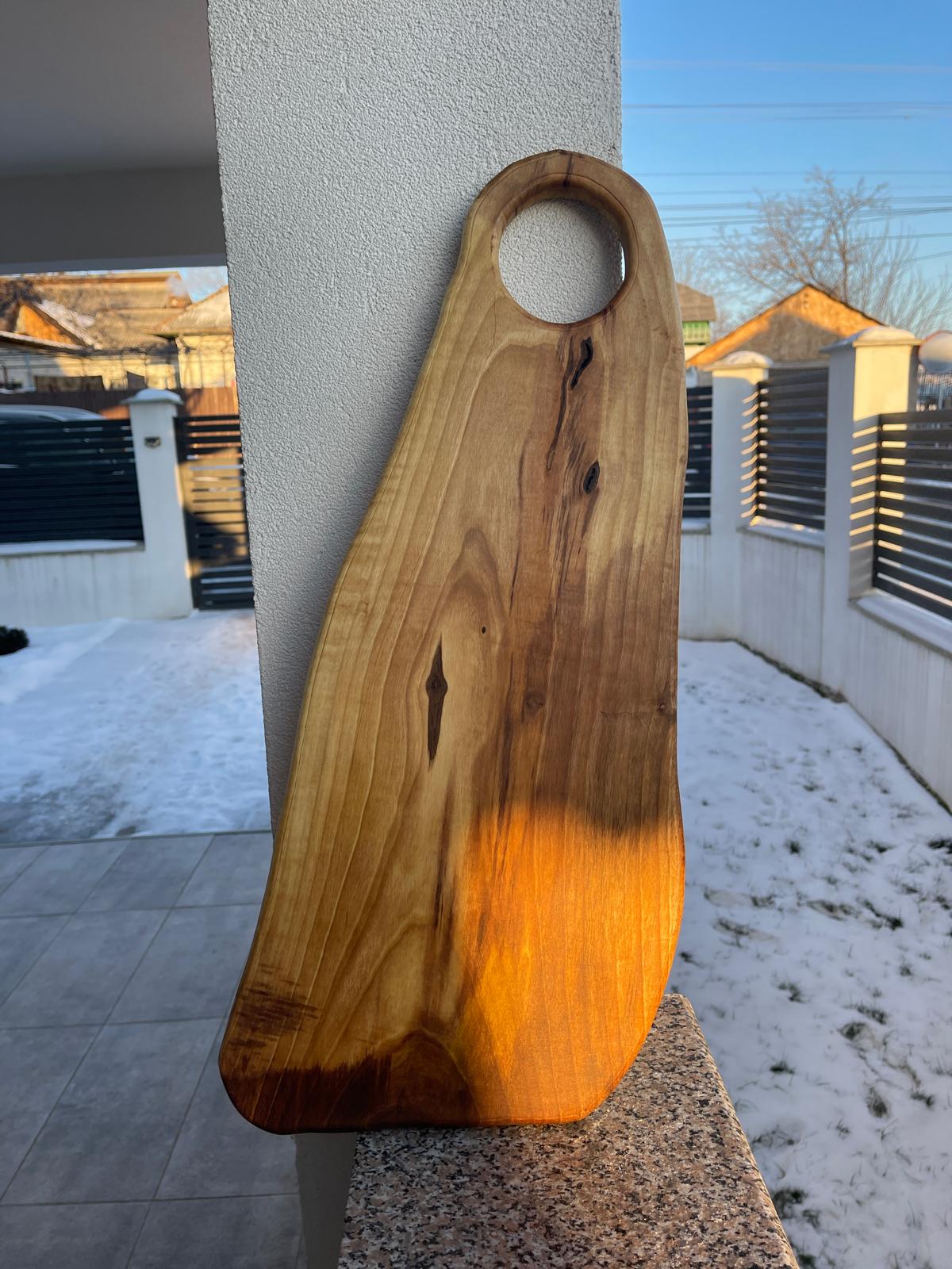 Cu dimensiunile de 60×25 cm, tocătorul oferă o suprafață generoasă de lucru, fiind potrivit pentru tăierea legumelor, cărnii sau pentru servire. Este o alegere ideală pentru cei care apreciază produsele handmade, durabile și cu un design unic.
