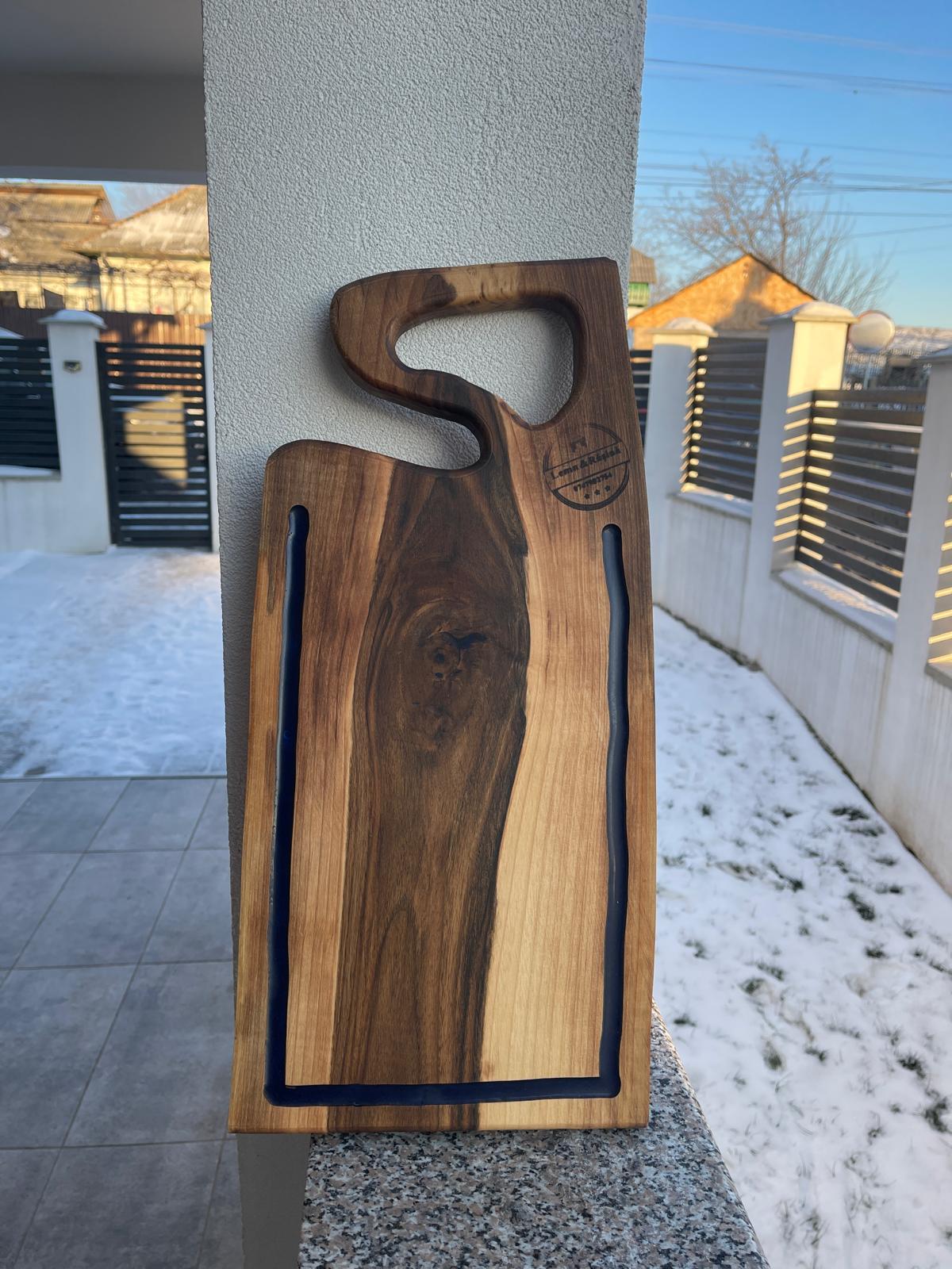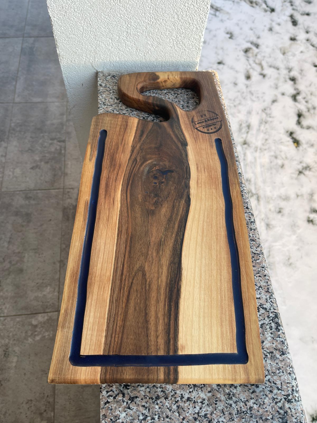 Tocătorul include inserții din rășină epoxidică albastră, aducând un accent modern și elegant, și este prevăzut cu scurgător pentru grăsimi, oferind o funcționalitate practică. Cele două fețe de utilizare permit mai multă versatilitate și ușurință în servire.