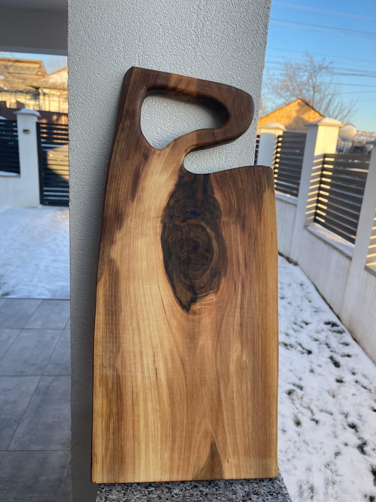Cu dimensiunile de 50x25x2,7 cm, tocătorul oferă o suprafață stabilă și generoasă pentru tăierea cărnii, legumelor sau pentru prezentarea preparatelor. Este un produs handmade, durabil și unicat, perfect pentru cei care apreciază combinația dintre lemnul natural și designul modern.