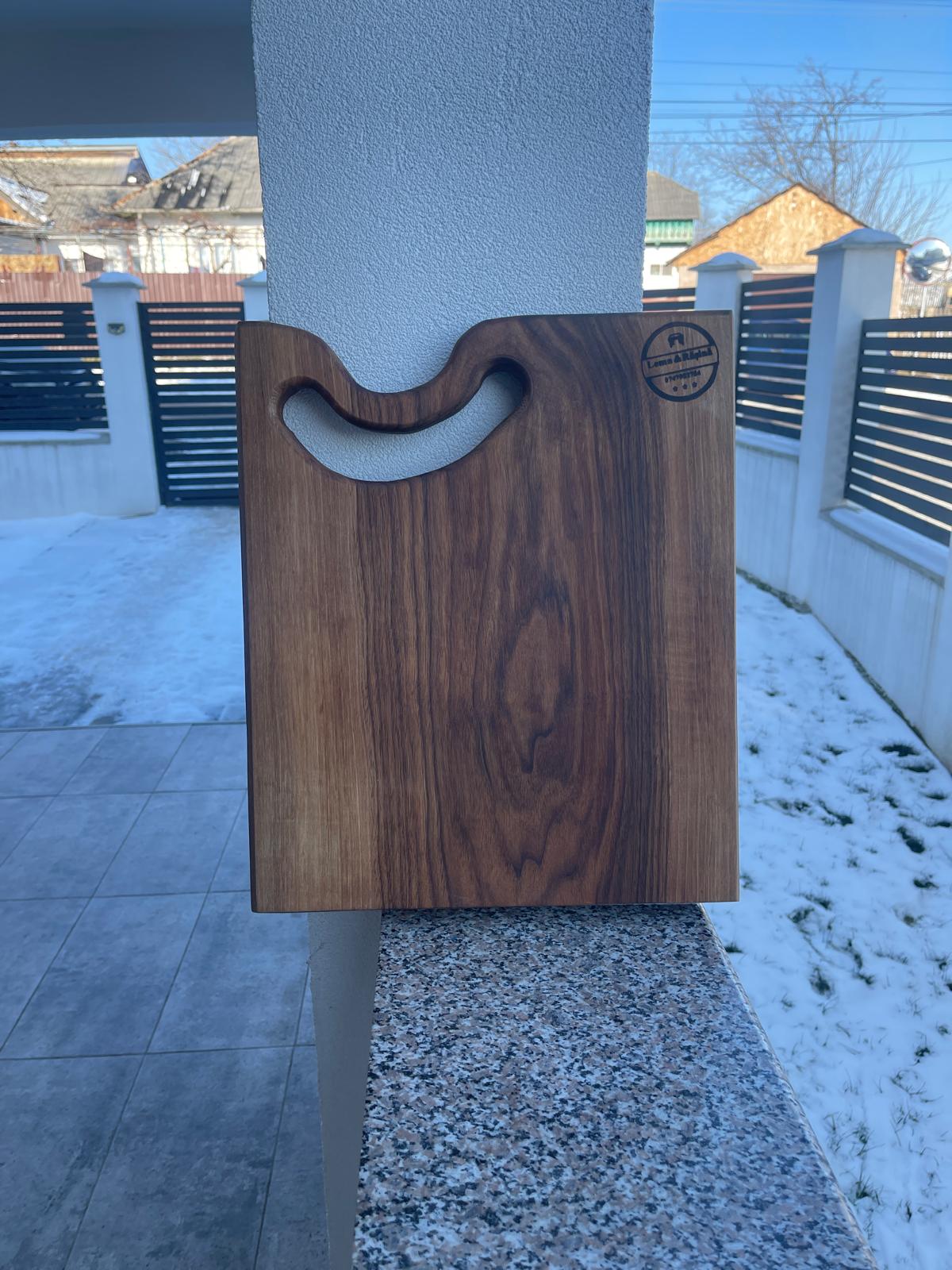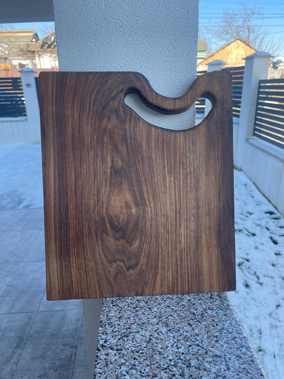 Tocător elegant din lemn de nuc masiv, cu margini tăiate la un unghi de 5°, finisaj premium și design modern. Dimensiuni 42x35x3,5 cm, ideal pentru tăiere și servire rafinată.