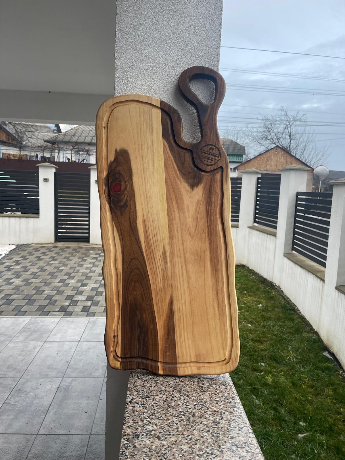 Acest tocator din lemn de nuc cu insertie de rasina rosie are dimensiunea generoasa de 75×31 cm, oferind suficient spatiu pentru taiere, portionare sau servire. Suprafata neteda si finisajele atent realizate il fac potrivit atat pentru utilizare zilnica in bucatarie, cat si pentru prezentarea preparatelor la mese festive sau evenimente speciale.
