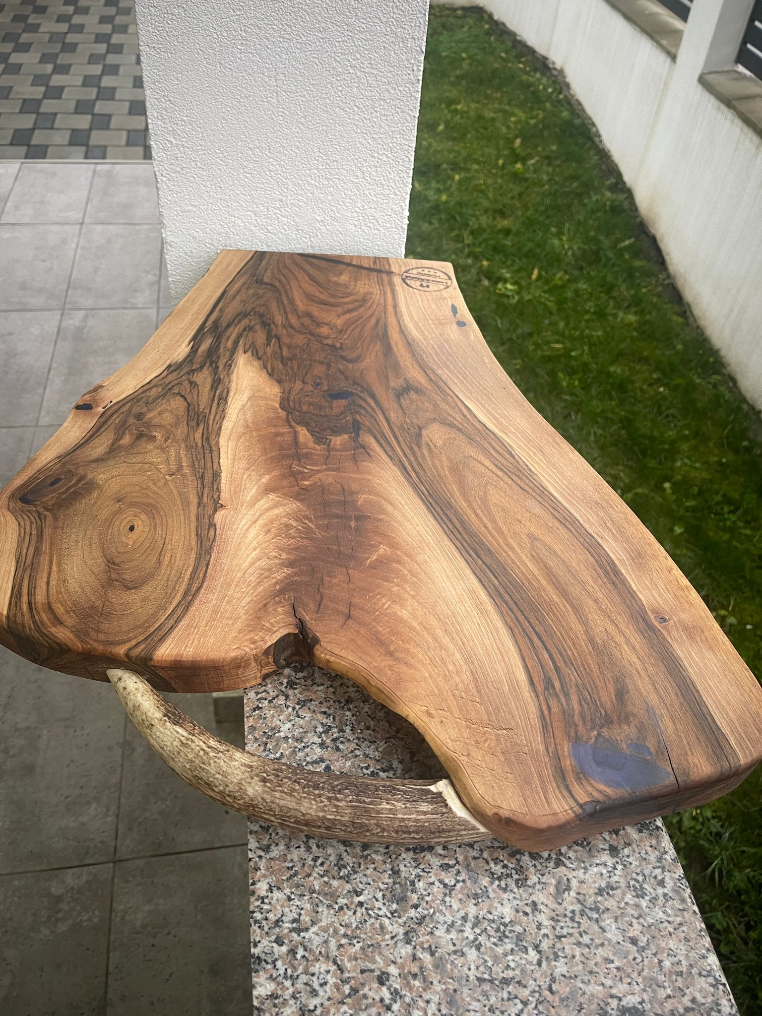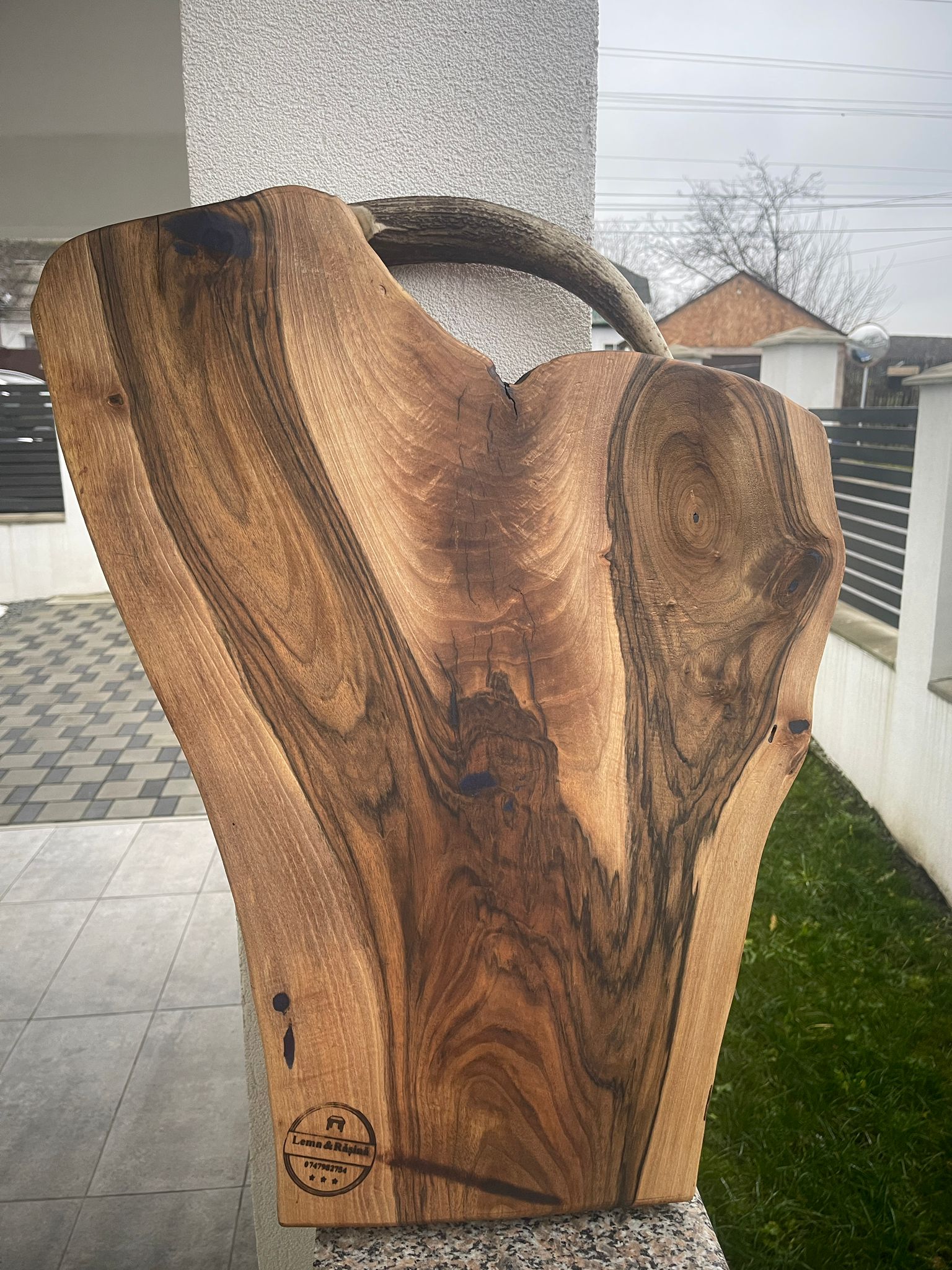 Acest tocător artizanal combină frumusețea naturală a lemnului de nuc cu un design modern, oferit de inserția de rășină epoxidică albastră. Mânerul din coarne autentice de cerb adaugă un accent rustic și exclusivist, făcând din acest tocător o piesă deosebită, atât funcțională, cât și decorativă.