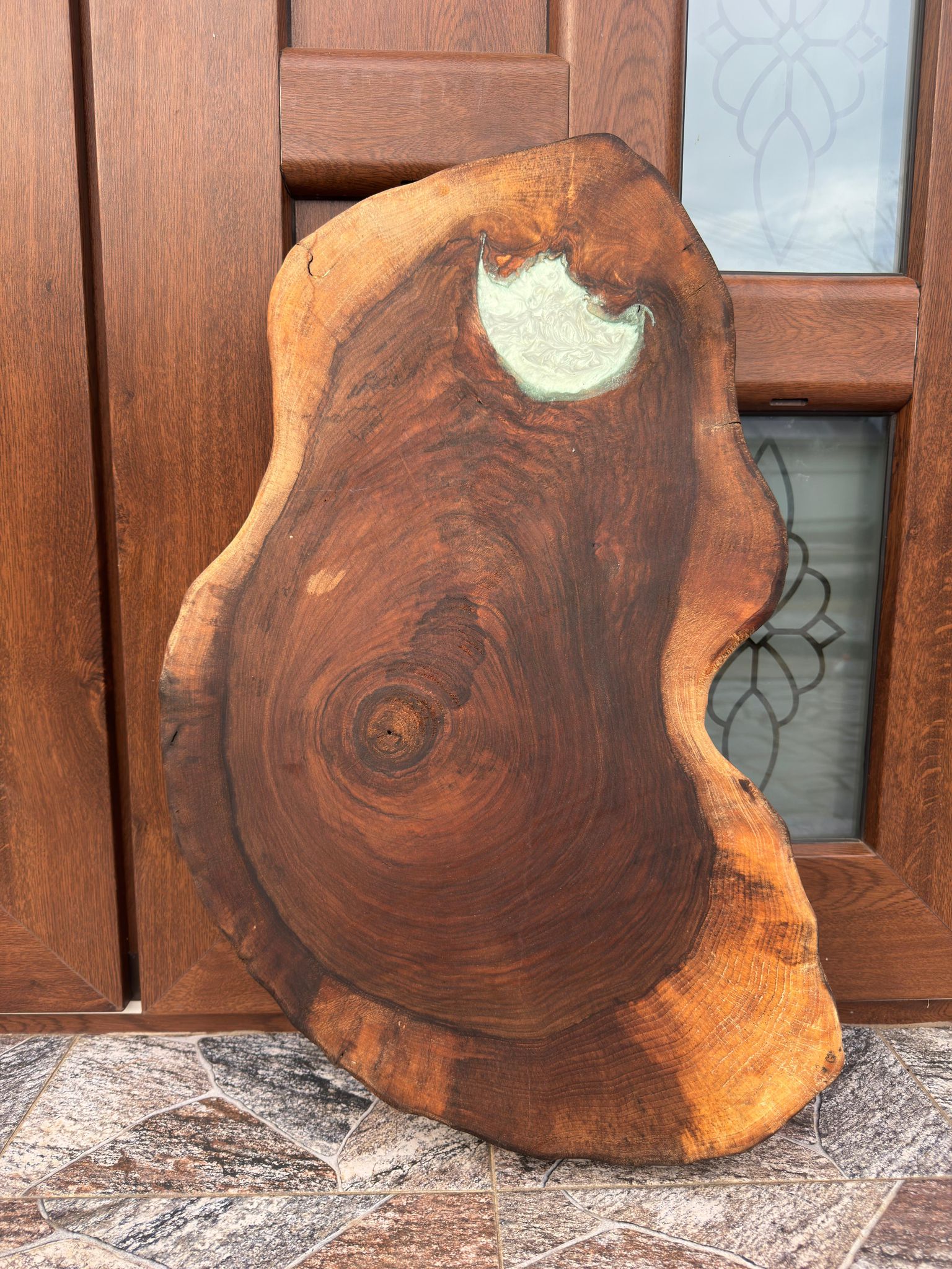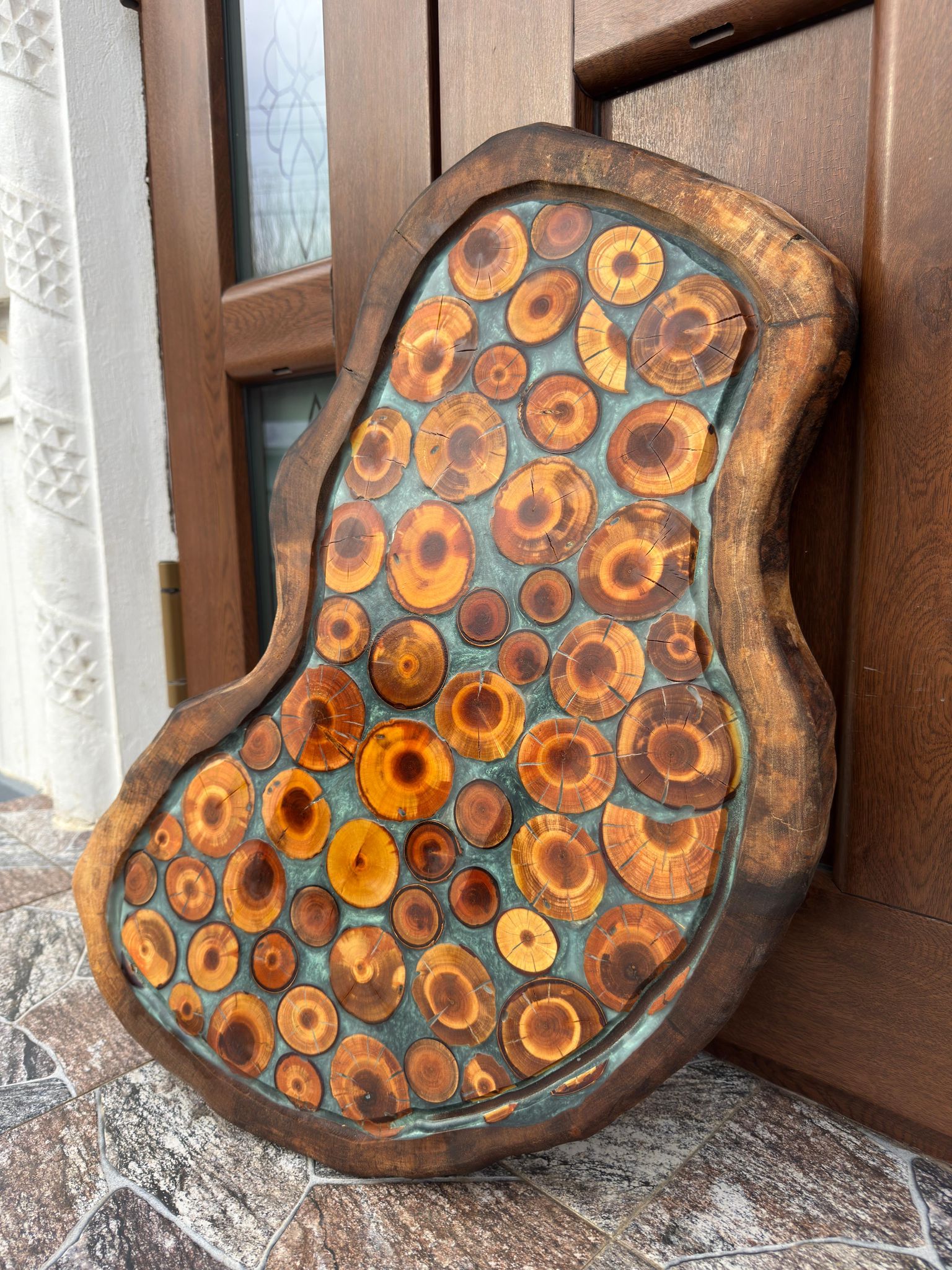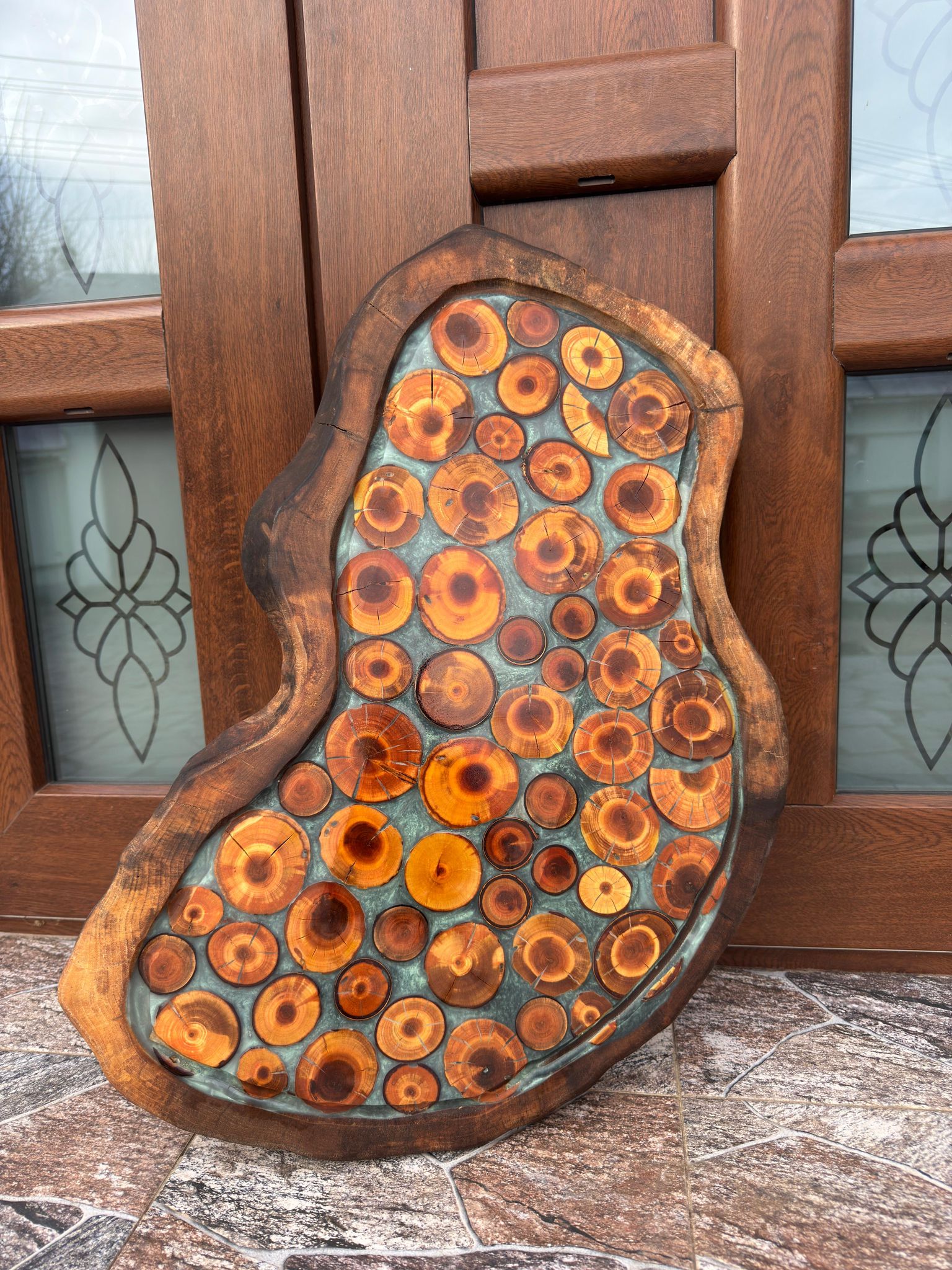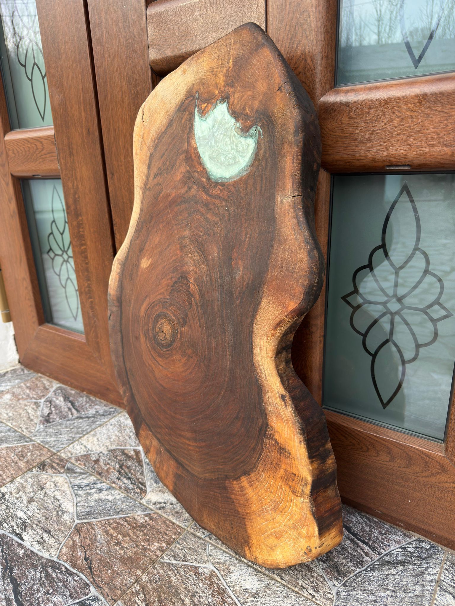 Fiecare piesă este unică, cu inserții de rondele de lemn naturale și detalii fine care evidențiază textura și culoarea lemnului. Rășina epoxidică protejează lemnul și îi oferă un luciu frumos, durabil în timp.