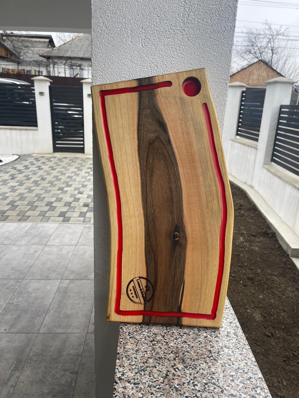 Fii primul care scrii o recenzie pentru „Tocător / Platou din Lemn de Nuc cu Inserție Roșie și Suport Pahar – Handmade – 48×25 cm”
