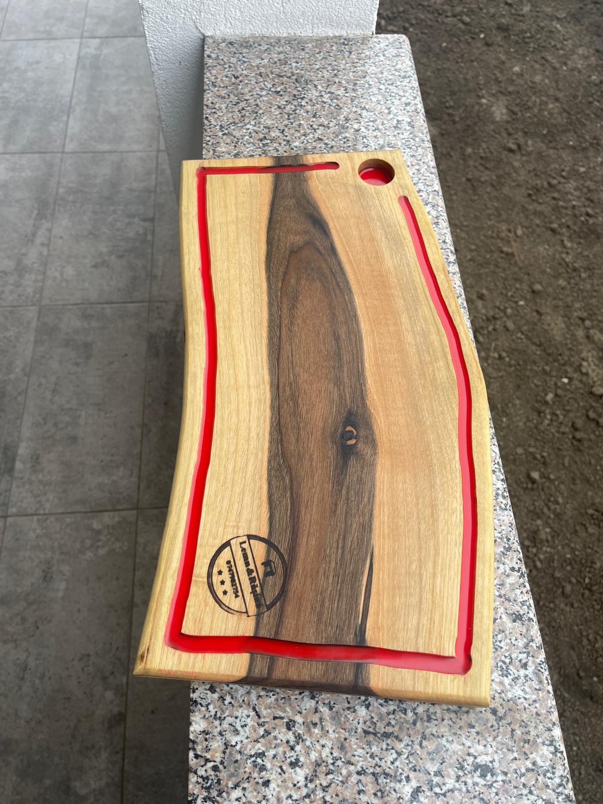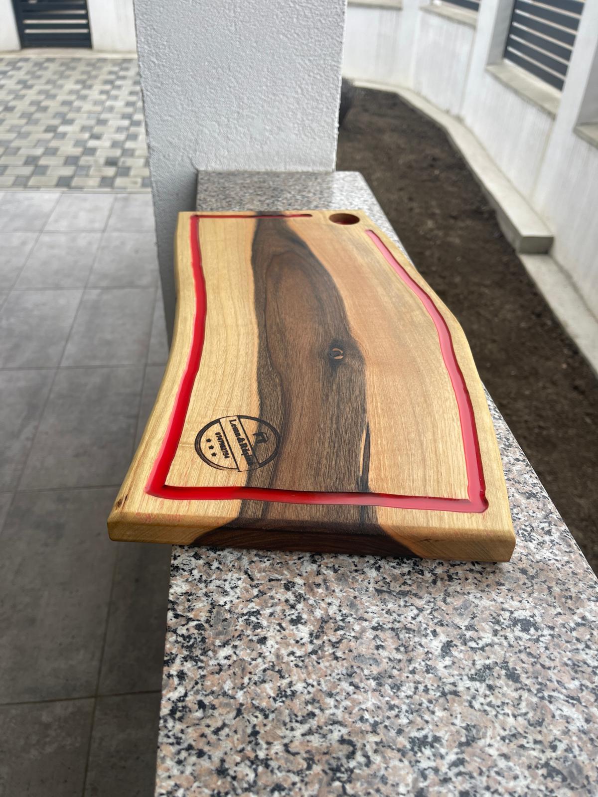 Tocător / Platou din Lemn de Nuc cu Inserție Roșie și Suport Pahar – Handmade – 48×25 cm