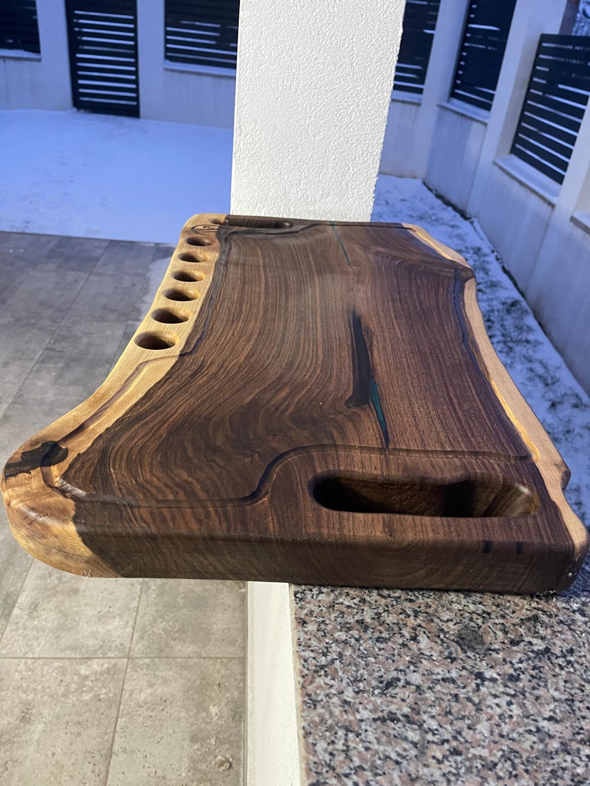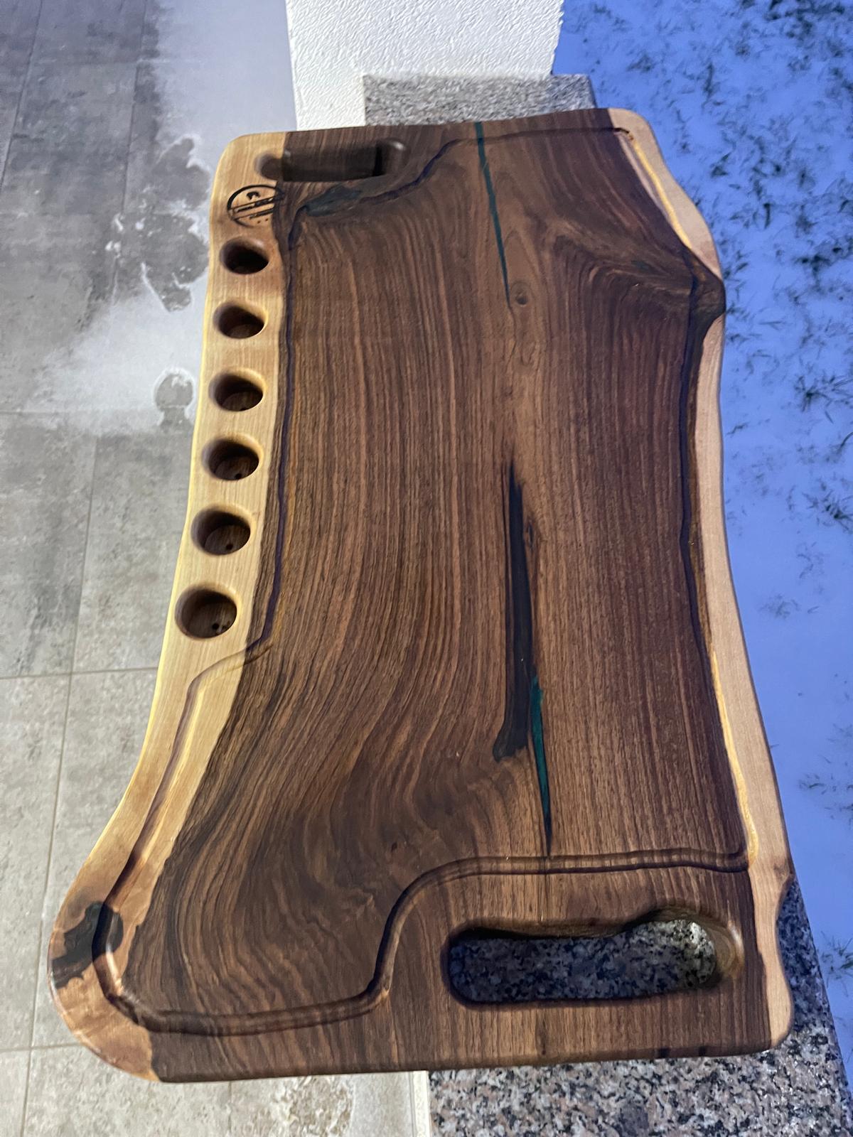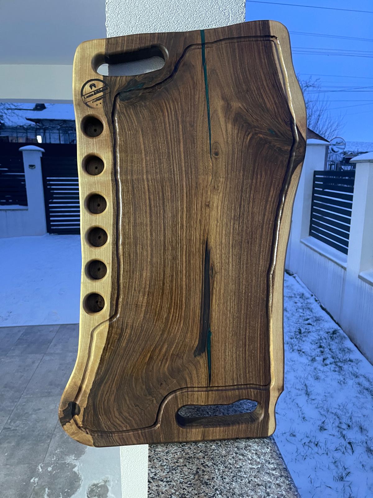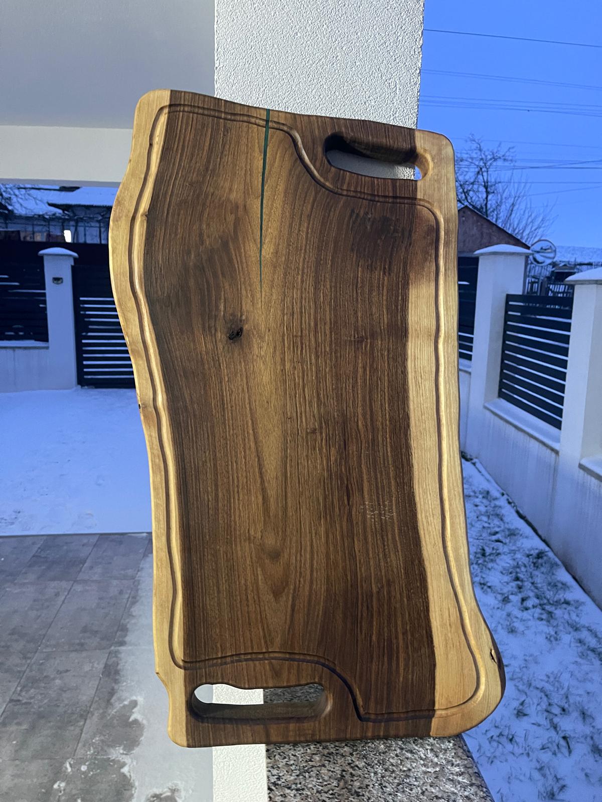 Tocător / platou realizat manual din lemn de nuc masiv, pus în valoare prin inserția elegantă de rășină epoxidică verde, care oferă un design modern și distinct fiecărei piese. Textura naturală a lemnului face ca fiecare produs să fie unic.
