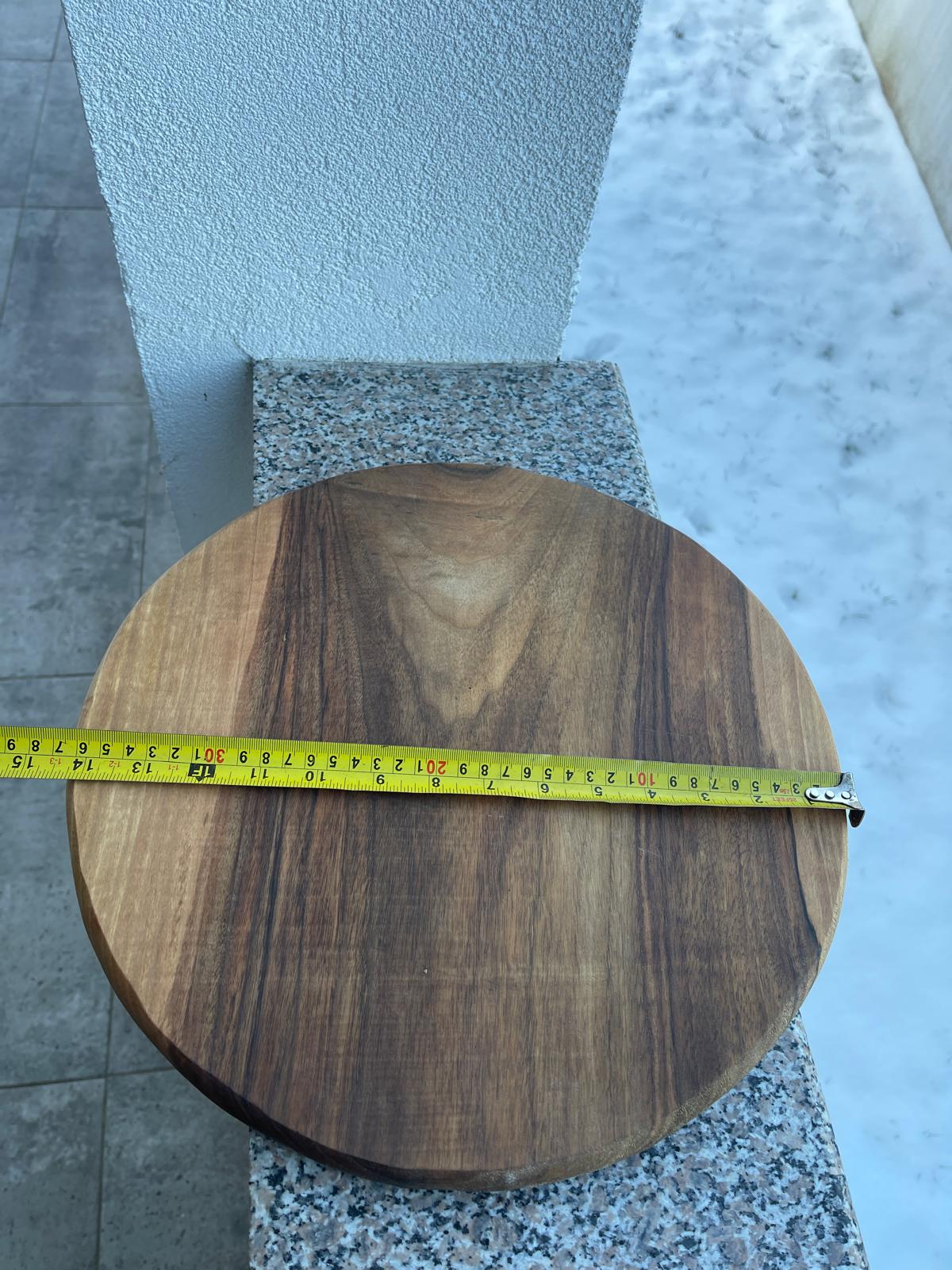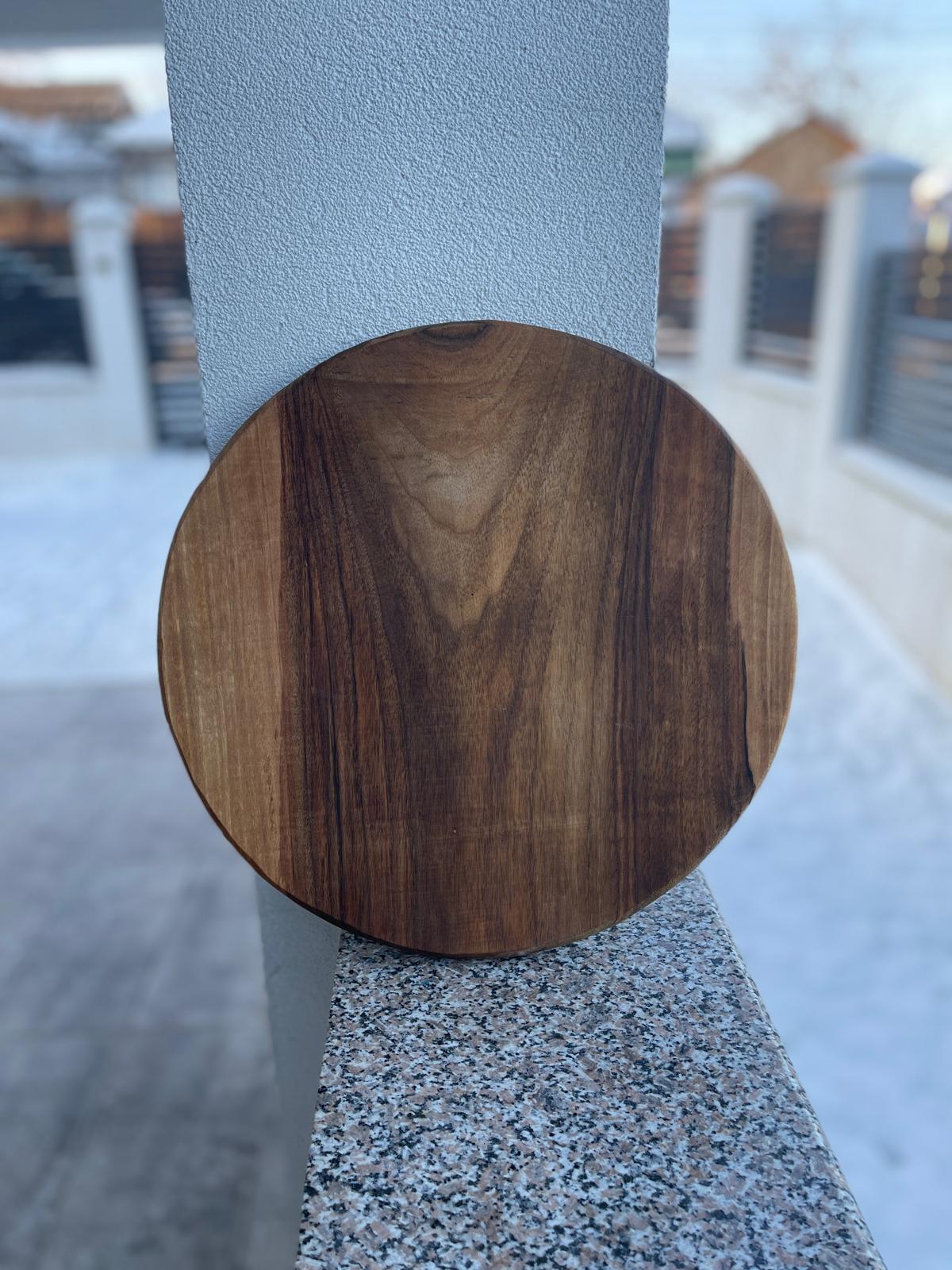 Tocator rotund din lemn masiv de nuc, cu design natural și diametru generos de 35 cm. Ideal pentru bucătărie, servire sau prezentare.